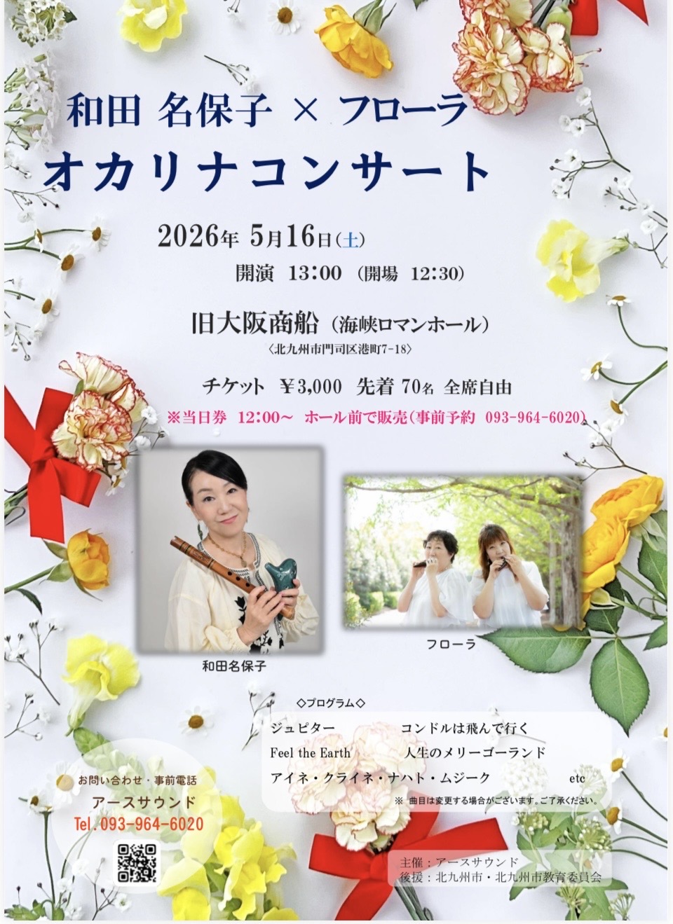 ★和田名保子×フローラ オカリナコンサート / コンサート / By --- 和田名保子×フローラ オカリナコンサート日程:2026.5.16(土)開場:12:30開演:13:00 会場:旧大阪商船(海峡浪漫ホール)場所:北九州市門司区港町7-18料金:¥3,000 先着70名 全席自由※当日券 12:00~ ホール前で販売(事前予約 093-964-6020)お問合せ・主催:アースサウンド TEL 093-964-6020後援:北九州市・北九州市教育委員会